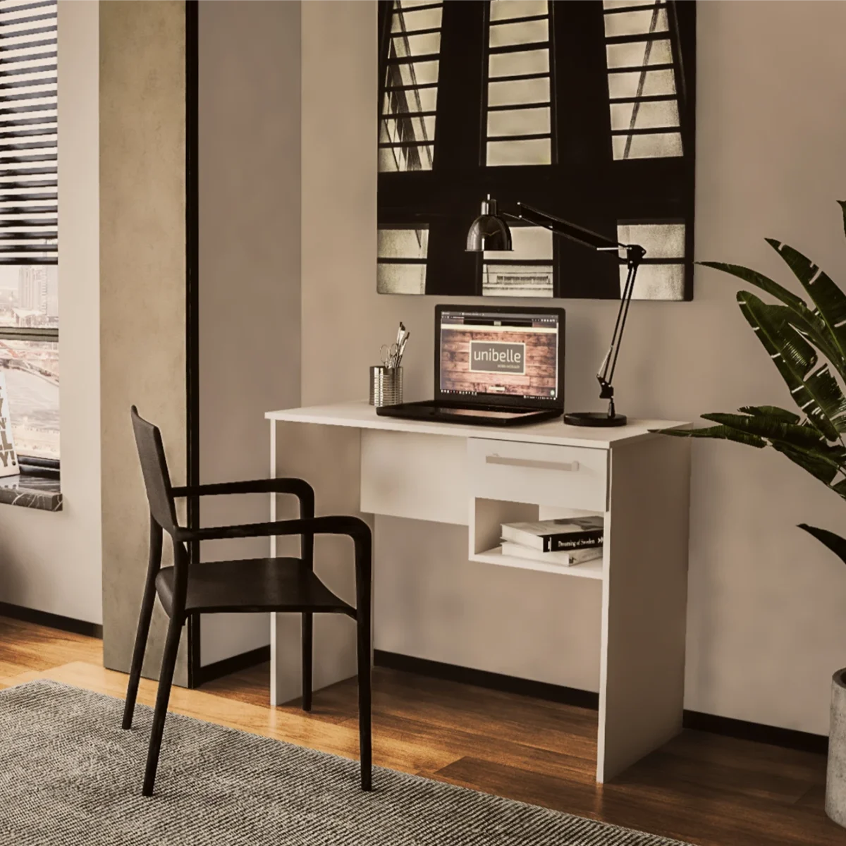 A Mesa Escrivaninha com 1 Gaveta e Nicho é perfeita para quem busca um espaço de trabalho compacto e funcional. Com um design moderno e minimalista, ela oferece a combinação ideal entre praticidade e estilo, sendo uma excelente opção para escritórios em casa, home offices ou quartos de estudo.