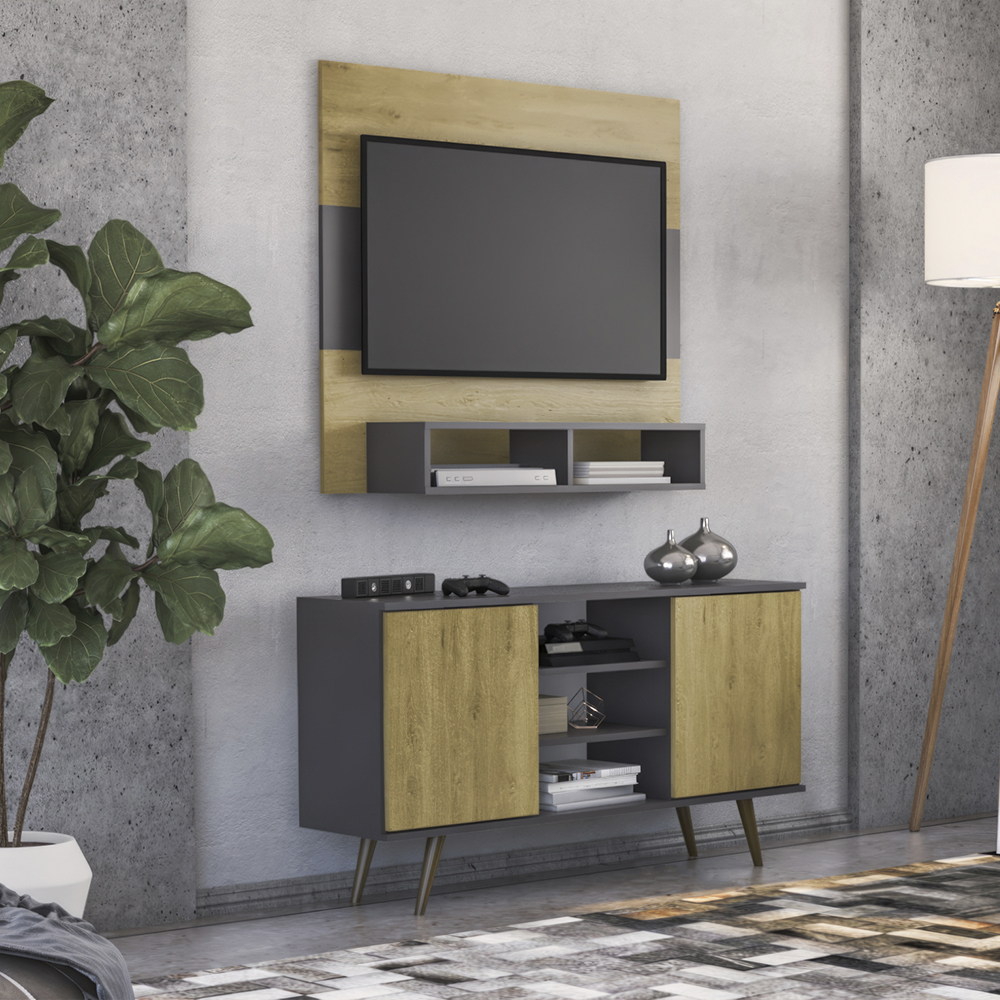 O Painel para TV nas cores Grafite e Mel Dakar é a escolha ideal para quem busca modernidade e praticidade na sala de estar. Com design elegante e funcional, ele se adapta facilmente a diversos estilos de decoração, oferecendo um suporte seguro para a sua TV e espaço adicional para organizar aparelhos eletrônicos, controles e itens decorativos.